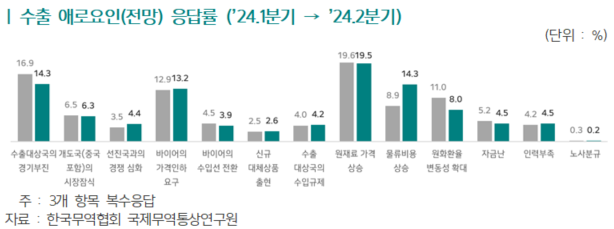 올해 2분기 수출 애로는 원자재 가격상승, 수출국 경기부진, 물류비용 상승 순으로 응답이 많았다. 원자재 가격 상승(19.5%)은 4분기 연속 수출기업의 최대 애로사항으로 지목되었다. 또한, 홍해 사태 및 파나마 운하 통항 차질 장기화로 인한 물류비용 상승(14.3%)으로 애로를 호소하는 기업 비중이 전 분기 대비 가장 크게 증가하였다(+5.4%p).