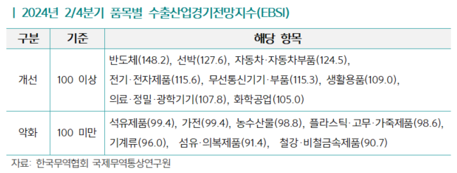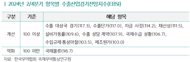 2024년 2분기 수출산업경기전망지수(EBSI)는 116.0으로, 2021년 2분기(120.8) 이후 12분기만에 가장 높은 수치를 기록하며, 우리 수출기업이 체감하는 수출 경기가 전분기 대비 크게 개선될 것으로 나타났다. 조사 대상 15개 품목 중 8개 품목에서 2분기 수출 호조를 예상하였으며, 특히 우리나라 주력 수출품목인 반도체(148.2)와 선박(127.6)의 수치가 높게 나와 전체 수출 산업 회복을 주도할 것으로 보인다. 반면에 철강·비철금속제품(90.7), 섬유·의복제품(91.4) 등은 약보합세를 보이며, 2분기 수출경기가 크게 나아지지 않을 것으로 전망하였다.